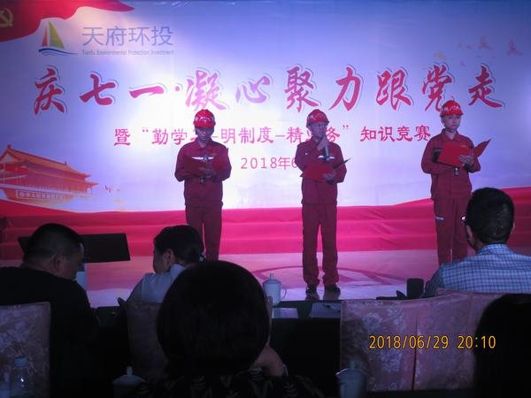 2018年6月29日,在喜迎中國共產黨誕辰97周年之際,應業主邀請,盤龍寺攔河閘工程項目部參加了由成都天府水城環保投資集團有限公司組織舉辦的慶“七•一”文藝演出。金堂縣有關領導、成都天府水城環保投資集團有限公司董事長及施工單位負責人觀看演出。