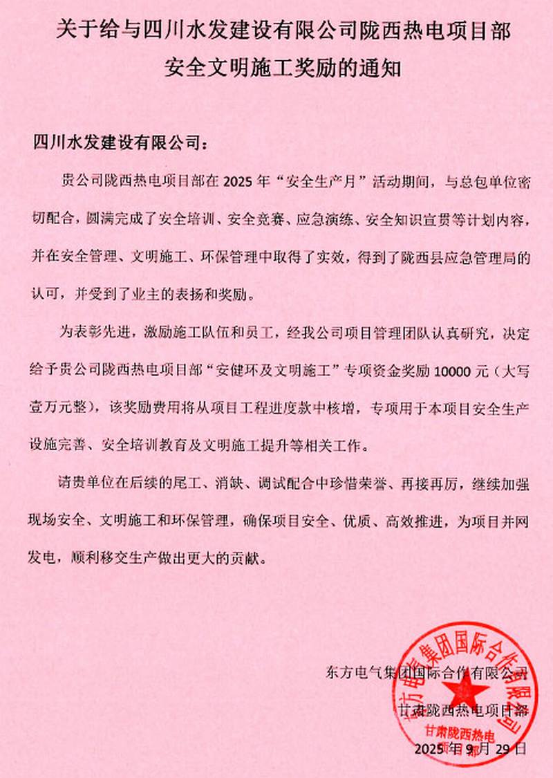 此次榮獲嘉獎,不僅是總承包方、業主及地方政府部門對項目部在安全管理體系的高度認可,更是對全體職工恪盡職守、精益求精的充分肯定。項目部將以此為契機,珍惜榮譽、再接再厲,以安全文明施工和優質高效履約擦亮公司名片,為項目并網發電、順利移交,助力生態文明建設貢獻力量。