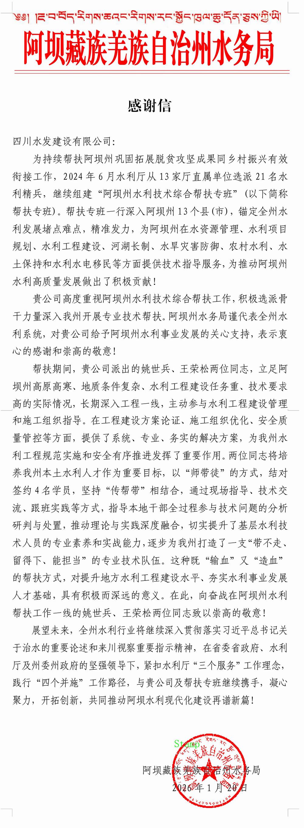 近日,公司收到阿壩藏族羌族自治州水務(wù)局的感謝信,信中對(duì)選派姚世兵、王榮松兩位技術(shù)骨干參與當(dāng)?shù)厮夹g(shù)綜合幫扶表示高度贊揚(yáng),并對(duì)公司重視幫扶工作、支持阿壩州水利事業(yè)發(fā)展致以衷心感謝與崇高敬意。